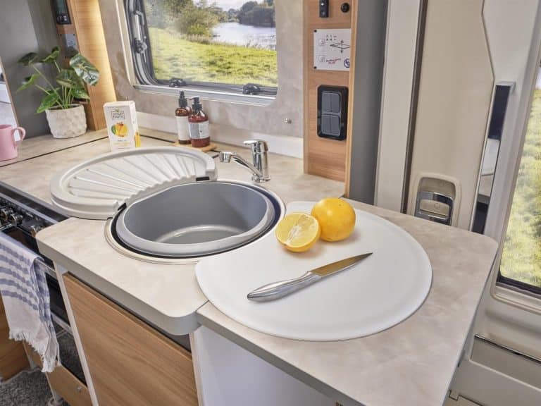 The kitchen is modern and comes with 3 gas hobs and oven. There is clever extra bench space available with a workbench extension and a large 141L full fridge and freezer which can keep your drinks cool and hold enough food for the whole family.