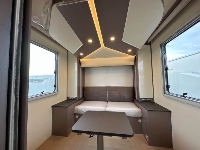 The lounge is very comfortable and has a Bürstner fold out table which can easily accommodate 5 people for a meal, watch a movie or a game of cards.